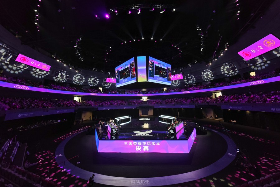 The photo taken on May 21, 2023 shows the scene of the Arena Of Valor Asian Games Version final at the "Charming Hangzhou" E-sports National Invitational Tournament in the Hangzhou E-sports Center. (Xinhua/Huang Zongzhi)
