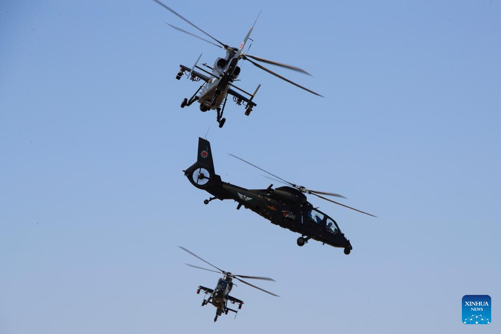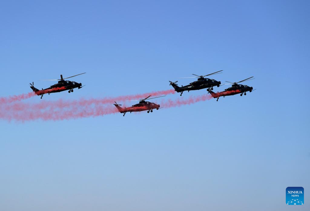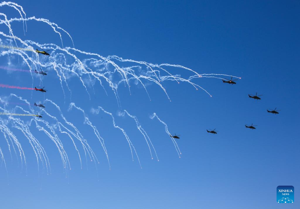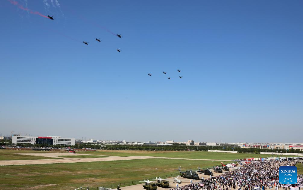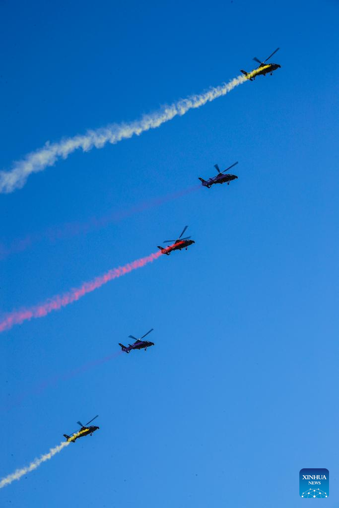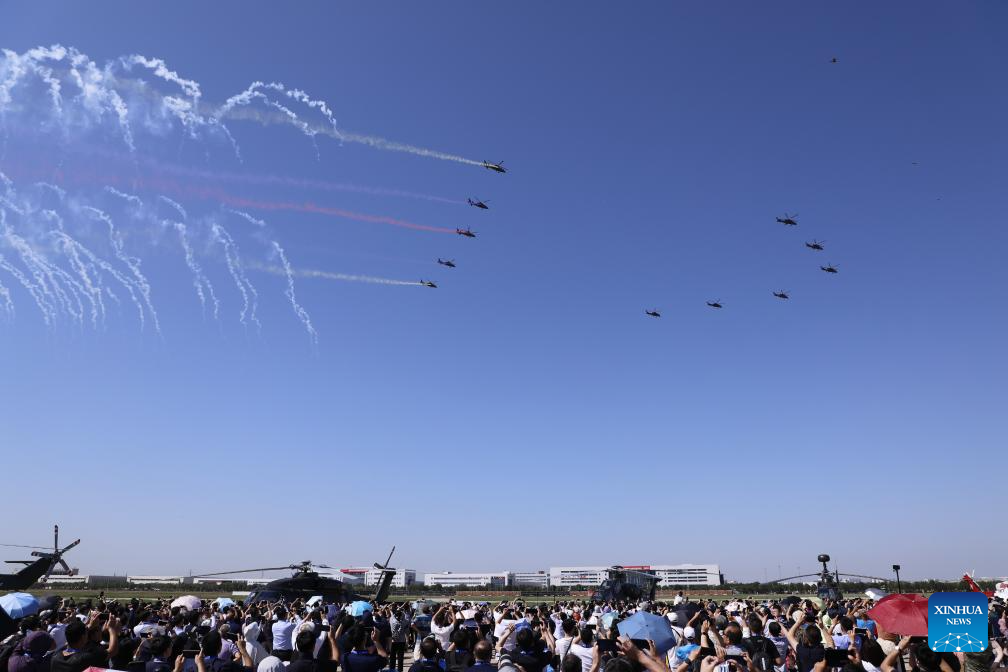 China's Fenglei aerobatic team performs at the opening ceremony of the 6th China Helicopter Exposition in north China's Tianjin Municipality Sept. 14, 2023. The 6th China Helicopter Exposition opened on Thursday in north China's Tianjin Municipality, highlighting innovation, development and win-win cooperation. The expo is set to host activities such as exhibitions, forums, air shows, new product releases and business negotiations, and aims to promote innovation, cooperation and development in the global helicopter industry. It is expected to attract more than 60,000 visitors. (Xinhua/Liu Fang)