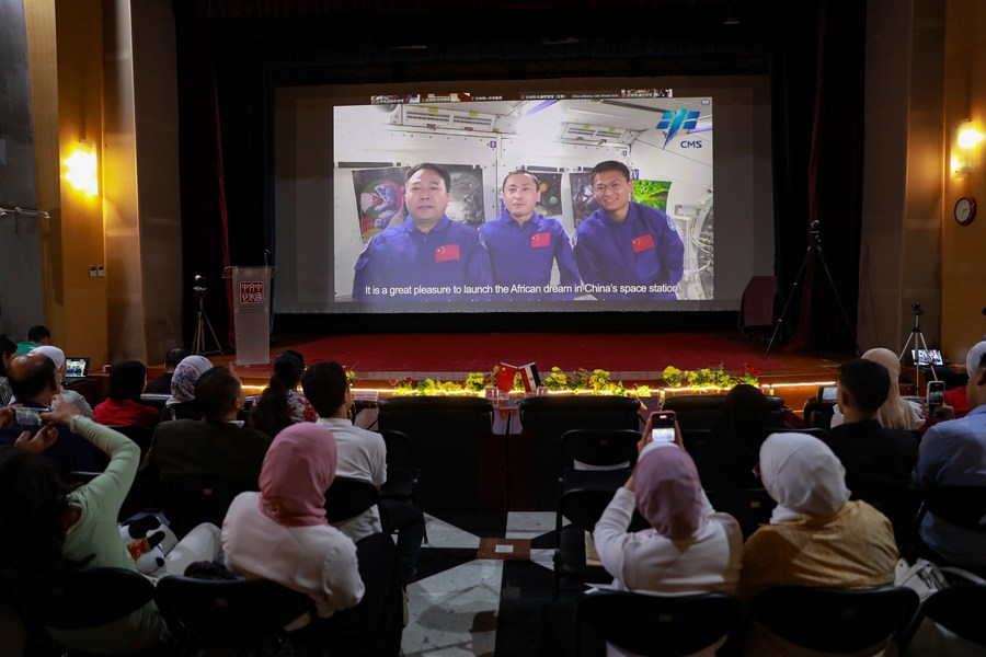 People attend a video link activity between Chinese astronauts from China's Tiangong Space Station and African teenagers in Cairo, Egypt, Sept. 13, 2023. (Xinhua/Sui Xiankai)