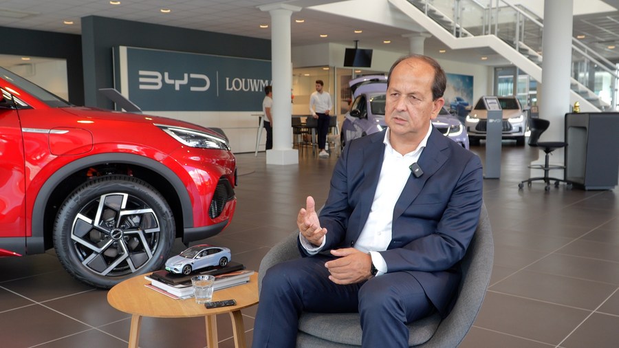 This photo was taken when Louwman Group's President Eric Louwman was interviewed by Xinhua in BYD's Rotterdam showroom, Aug. 15, 2023. (LiuYuxuan/Xinhua)