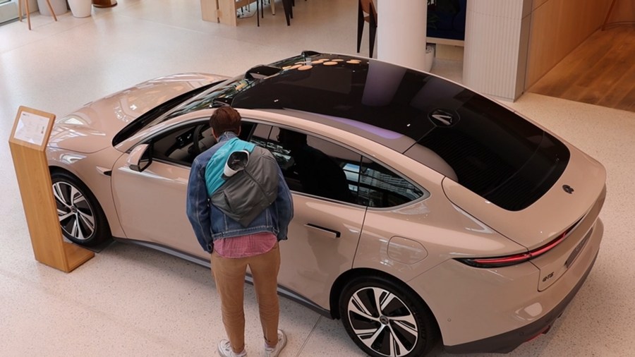 A guest was looking carefully at a car model displayed in NIO's Berlin showroom, Aug. 10, 2023. (Li Chao/Xinhua)
