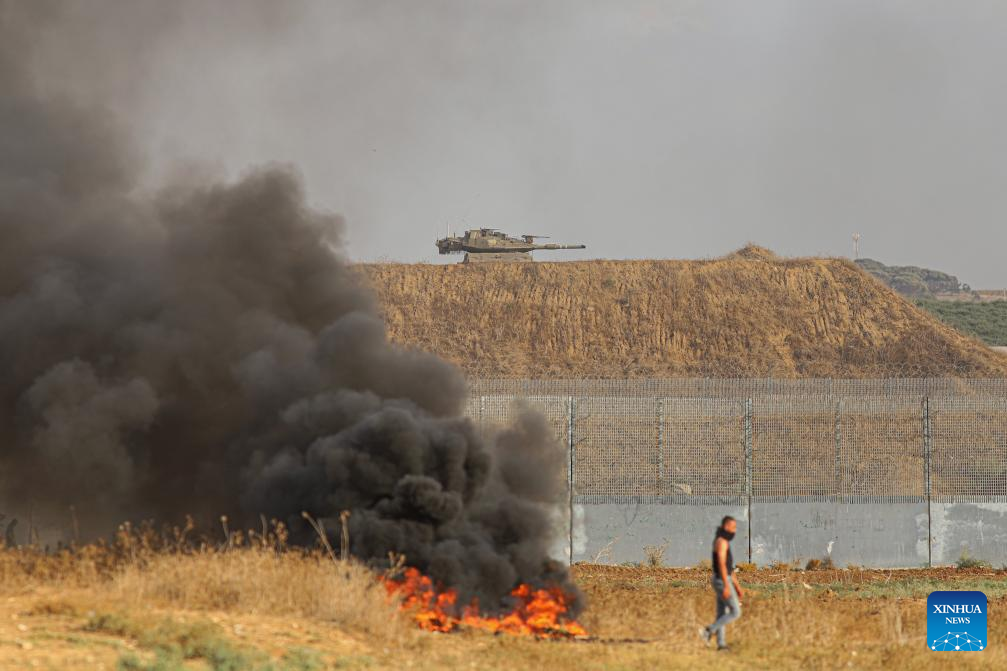 Smoke rises during clashes between Palestinians and Israeli soldiers near the fence of the Gaza-Israel border, east of Gaza City, on Sept. 13, 2023. At least four Palestinians were killed in a blast near the border with Israel, east of Gaza City. (Photo by Rizek Abdeljawad/Xinhua)