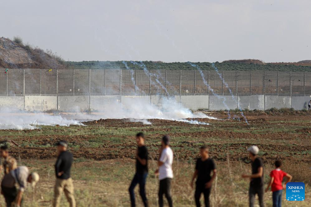Israeli soldiers fire tear gas canisters during clashes with Palestinians near the fence of the Gaza-Israel border, east of Gaza City, on Sept. 13, 2023. At least four Palestinians were killed in a blast near the border with Israel, east of Gaza City. (Photo by Rizek Abdeljawad/Xinhua)