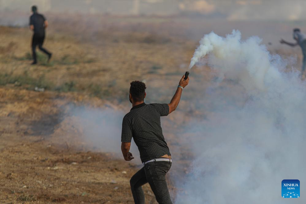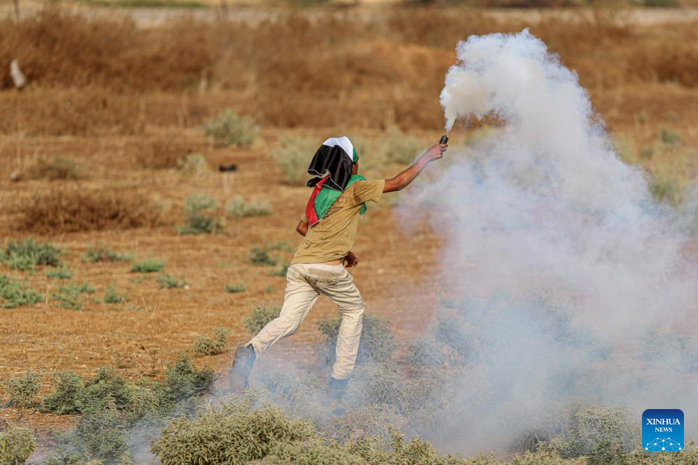 A Palestinian protester throws back a tear gas canister fired by an Israeli soldier during clashes near the fence of the Gaza-Israel border, east of Gaza City, on Sept. 13, 2023. At least four Palestinians were killed in a blast near the border with Israel, east of Gaza City. (Photo by Rizek Abdeljawad/Xinhua)
