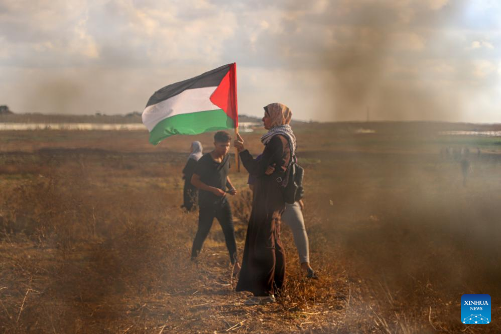 A Palestinian woman holds a flag during clashes with Israeli soldiers near the fence of the Gaza-Israel border, east of Gaza City, on Sept. 13, 2023. At least four Palestinians were killed in a blast near the border with Israel, east of Gaza City. (Photo by Rizek Abdeljawad/Xinhua)