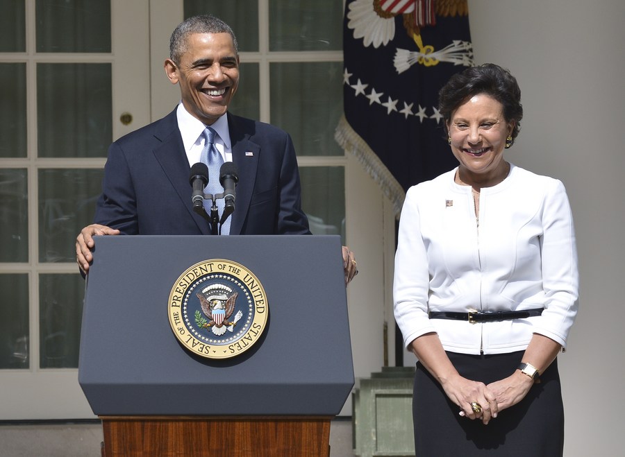 U.S. President Barack Obama (L) nominates Chicago businesswoman Penny Pritzker (R) as the new Commerce Secretary during a ceremony in the Rose Garden of the White House in Washington, D.C., the United States, May 2, 2013. (Xinhua/Zhang Jun)