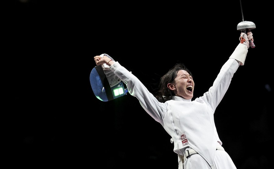 Sun Yiwen celebrates after winning the women's epee individual final against Ana Maria Popescu of Romania at the 2020 Olympic Games in Tokyo on July 24, 2021. (Xinhua/Li Ming)
