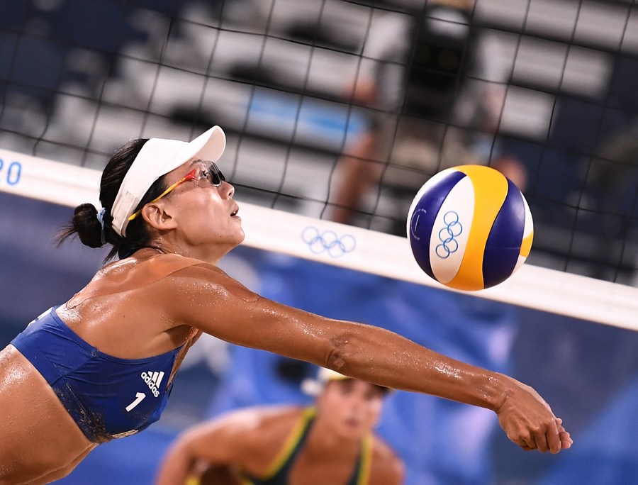 Xue Chen digs the ball during the women's beach volleyball round of 16 match against Australia at the 2020 Olympic Games in Tokyo, Japan on Aug. 1, 2021. (Xinhua/Li He)