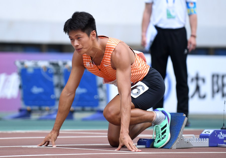 Xie Zhenye prepares before the men's 200m final at the 2023 Chinese National Athletics Championships in Shenyang, northeast China's Liaoning Province on June 29, 2023. (Xinhua/Long Lei)