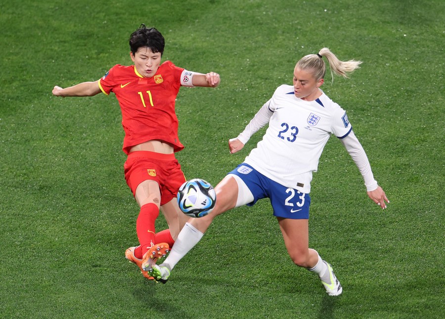 Wang Shanshan (L) vies with England's Alessia Russo during their Group D match at the 2023 FIFA Women's World Cup in Adelaide, Australia on Aug. 1, 2023. (Xinhua/Ding Xu)