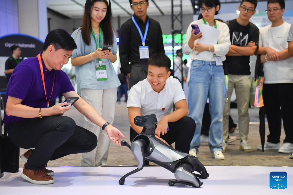 Visitors interact with a robot dog during the 2023 World Computing Conference in Changsha, central China's Hunan Province, Sept. 15, 2023.