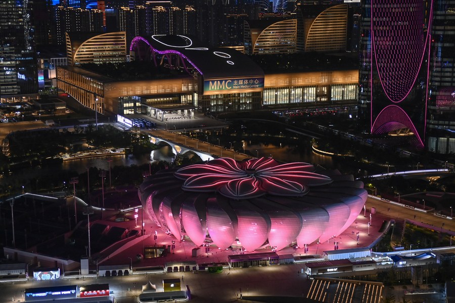 This aerial photo taken on Sept. 9, 2023 shows the Hangzhou Olympic Sports Center's Tennis Center in Hangzhou, east China's Zhejiang Province. (Xinhua/Huang Zongzhi)