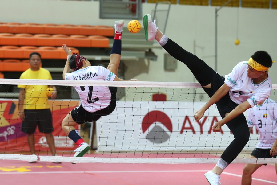 Members of Myanmar's national sepak takraw team attend a training session for the upcoming 19th Asian Games in Hangzhou at Wunna Theikdi Indoor Stadium in Nay Pyi Taw, Myanmar, Sept. 7, 2023. (Photo by Myo Kyaw Soe/ Xinhua)