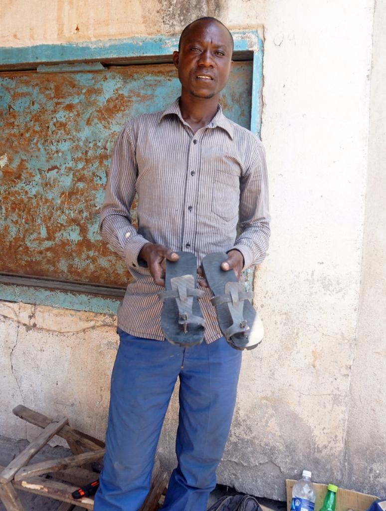Frank Mwaba holds a pair of unisex sandals he made from an old tire in Kapiri Mposhi district, Zambia, on Oct. 19, 2022. (Photo by Lillian Banda/Xinhua)