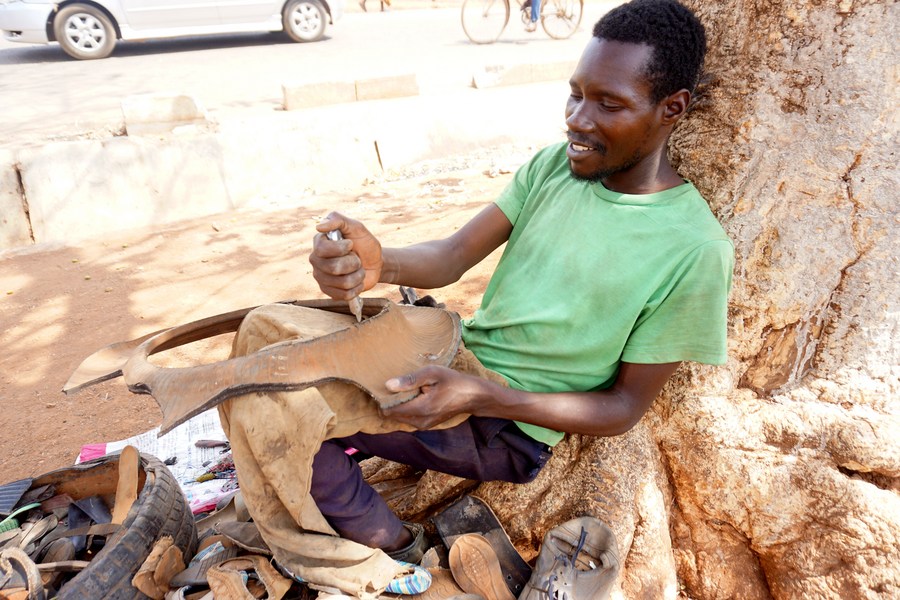 Photo taken on Oct. 22, 2022 shows Scout Phiri, a shoe repairer going about his business in Petauke district, Zambia. (Photo by Lillian Banda/Xinhua)