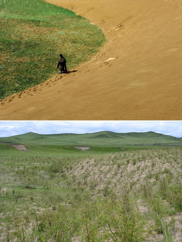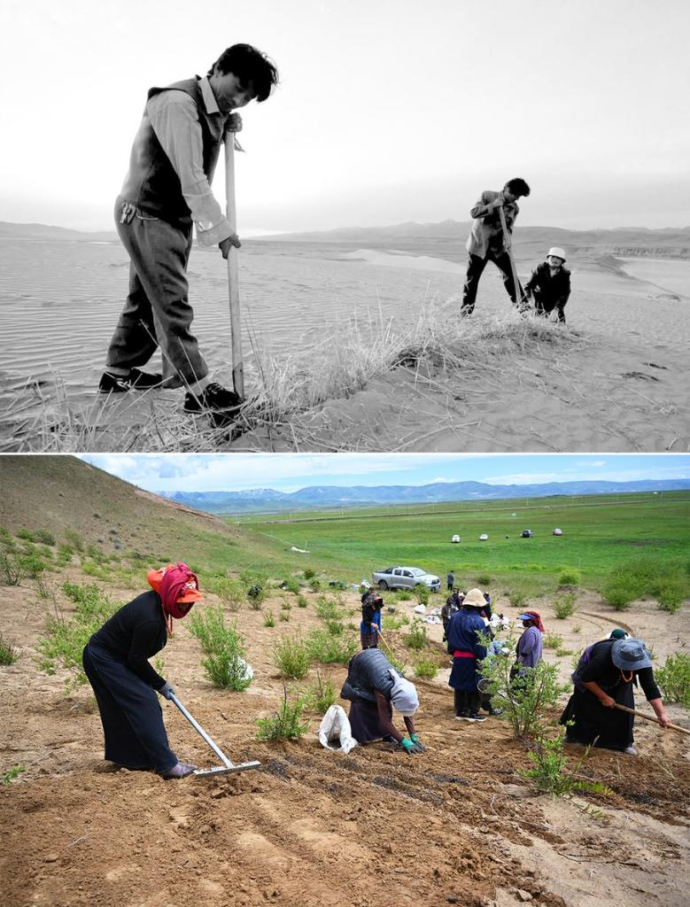 This combo photo shows staff members making sand barriers on a degraded grassland (above, photo taken by Xinhua photographer Han Chuanhao in 2002) and villagers sowing grass seeds on a grassland management point (below, photo taken by Xinhua photographer Zhang Keren on July 6, 2023) along the Yellow River in Maqu County, Gannan Tibetan Autonomous Prefecture, northwest China's Gansu Province. (Xinhua)