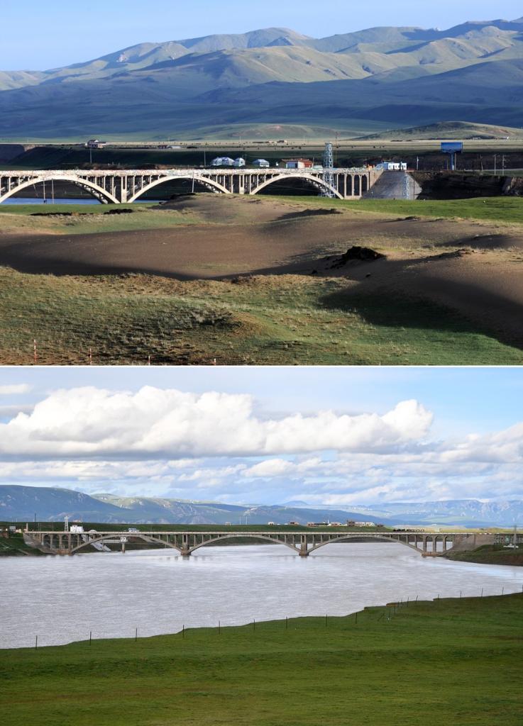 This combo photo shows a degraded grassland (above, photo taken by Xinhua photographer Nie Jianjiang on June 10, 2011) and the grassland after restoration (below, photo taken by Xinhua photographer Chen Bin on July 6, 2023) near the Yellow River bridge in Maqu County, Gannan Tibetan Autonomous Prefecture, northwest China's Gansu Province. (Xinhua)