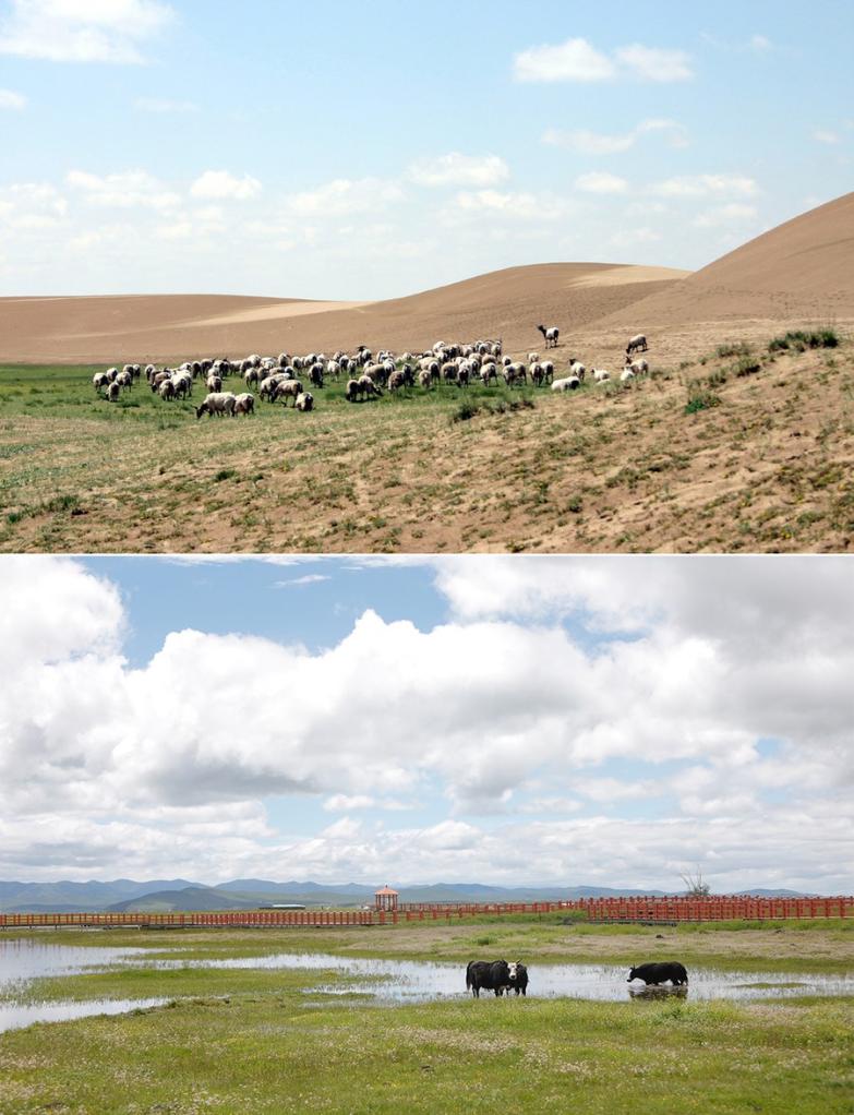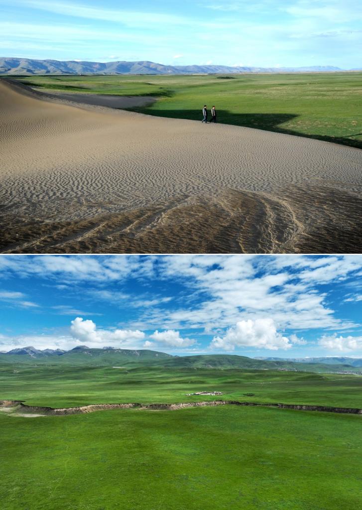 This combo photo shows a flock of goats grazing on a degraded grassland (above, photo taken by Xinhua photographer Song Changqing on July 19, 2004) and yaks grazing on a grassland (below, photo taken by Xinhua photographer Chen Bin on July 5, 2023) in Maqu County, Gannan Tibetan Autonomous Prefecture, northwest China's Gansu Province. (Xinhua)