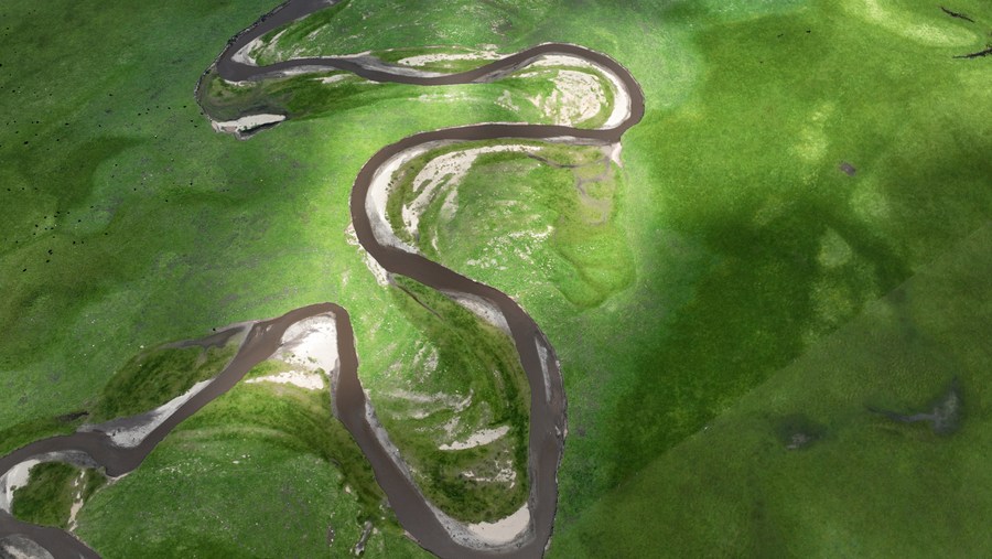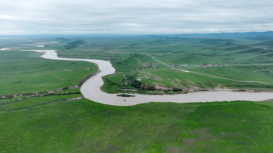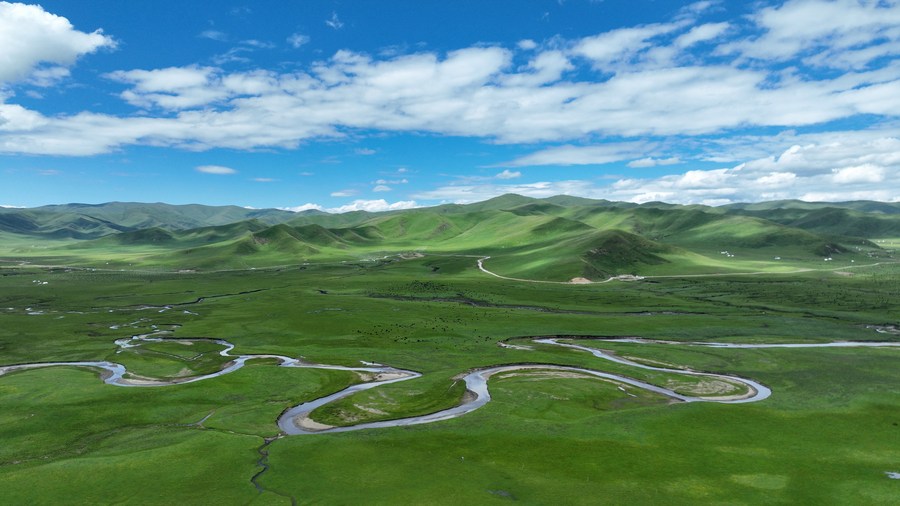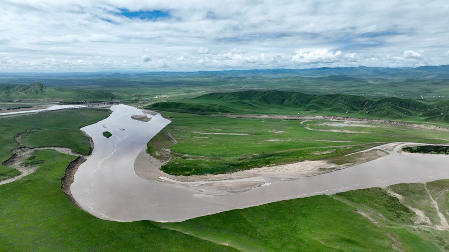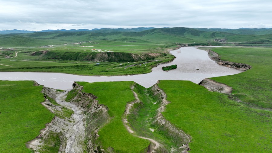 This aerial photo taken on July 6, 2023 shows a grassland after restoration along the Yellow River in Maqu County, Gannan Tibetan Autonomous Prefecture of northwest China's Gansu Province. (Xinhua/Zhang Keren)