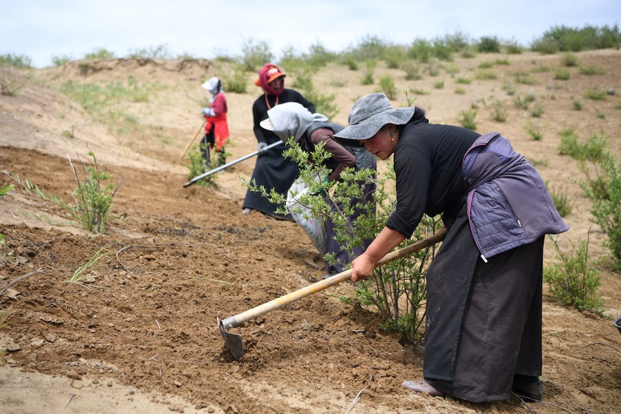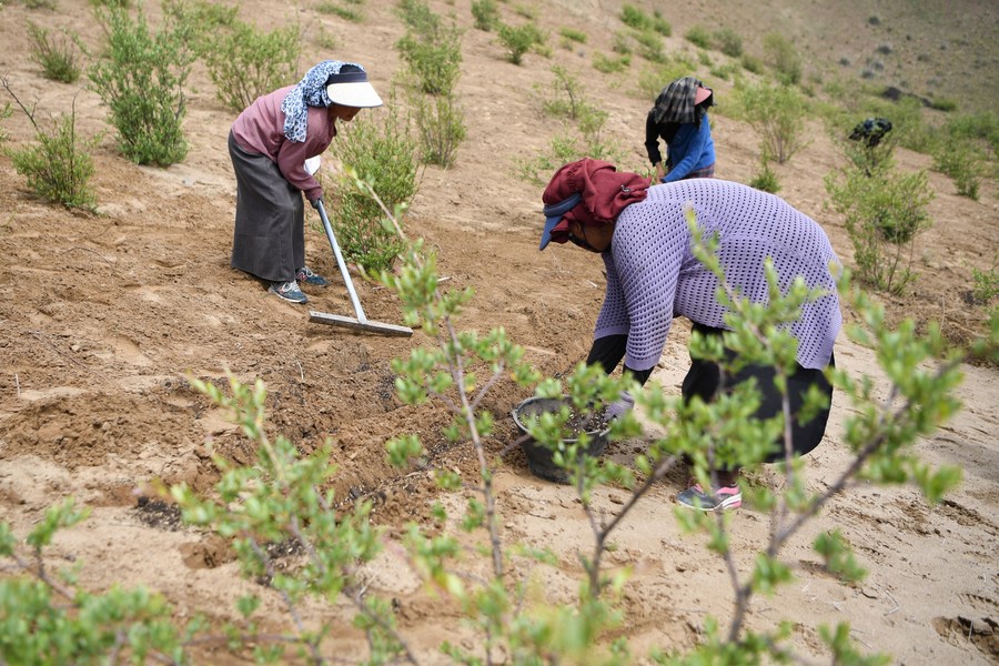 Villagers sow grass seeds on a grassland management point along the Yellow River in Oula Town of Maqu County, Gannan Tibetan Autonomous Prefecture, northwest China's Gansu Province, July 6, 2023. (Xinhua/Fang Xin)