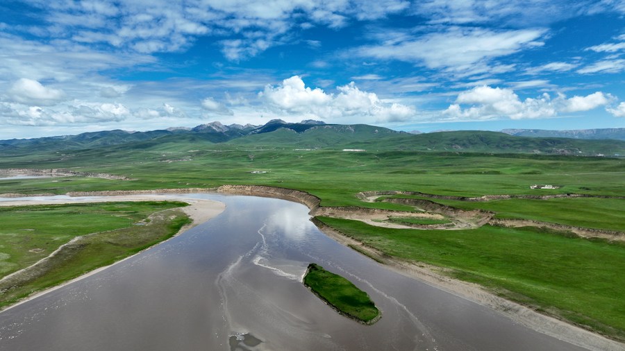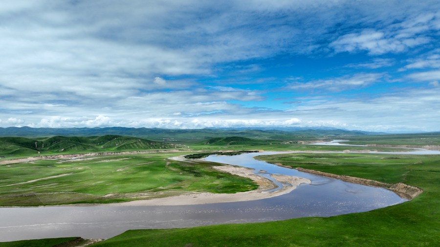 This aerial photo taken on July 6, 2023 shows the scenery along the Yellow River in Maqu County, Gannan Tibetan Autonomous Prefecture of northwest China's Gansu Province. (Xinhua/Zhang Keren)