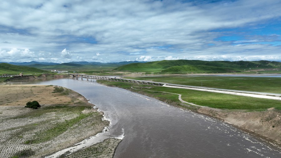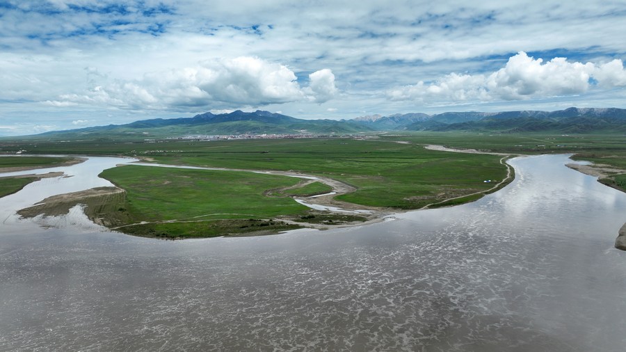 This aerial photo taken on July 6, 2023 shows the scenery along the Yellow River in Maqu County, Gannan Tibetan Autonomous Prefecture of northwest China's Gansu Province. (Xinhua/Fang Xin)