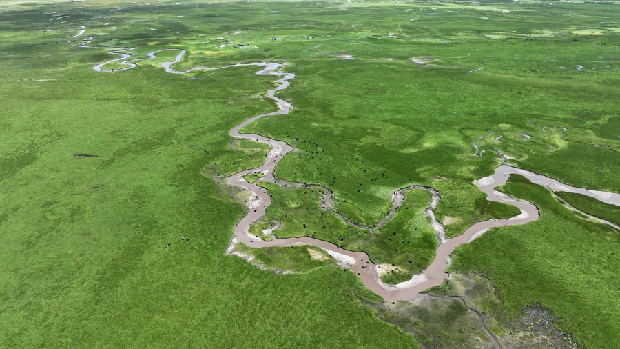 This aerial photo taken on July 5, 2023 shows the wetland at the Hequ horse ranch in Maqu County, Gannan Tibetan Autonomous Prefecture of northwest China's Gansu Province. (Xinhua/Zhang Keren)