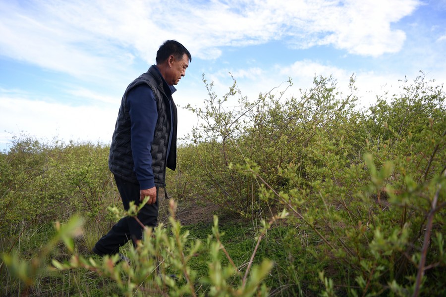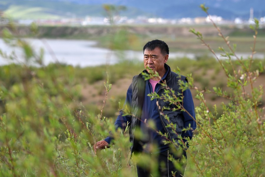 Villager Zhoima Gyaibo checks the growth of plants at a grassland management point along the Yellow River in Maqu County, Gannan Tibetan Autonomous Prefecture, northwest China's Gansu Province, July 5, 2023. (Xinhua/Chen Bin)
