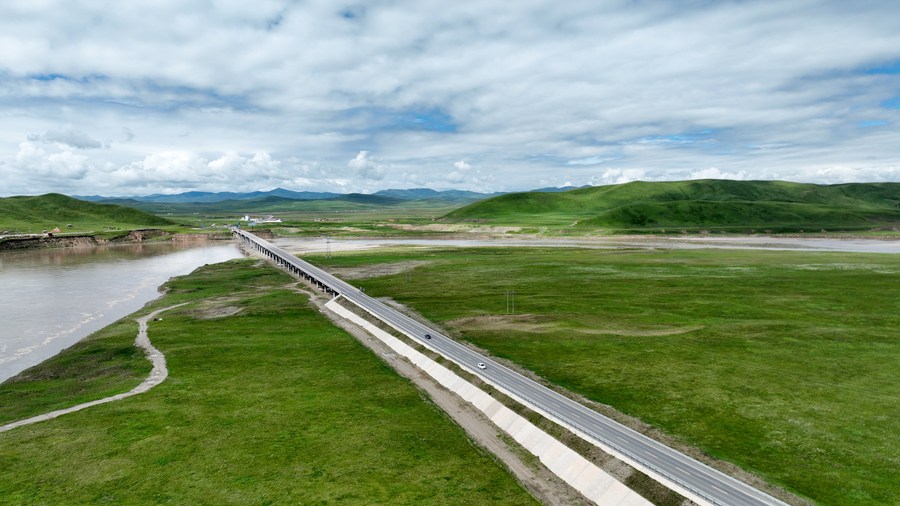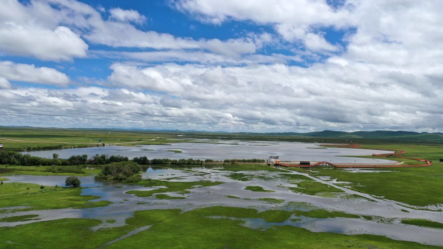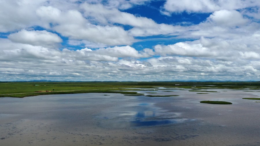 GANNAN, Sept. 16 (Xinhua) -- Located on the northeast rim of the Qinghai-Tibet Plateau, Maqu County boasts an extensive presence of grasslands and wetlands. Maqu, meaning "the Yellow River" in the Tibetan language, is the only county named after "Yellow River" in China. Covering an area of 5.62 million mu (about 374,667 hectares), the Maqu wetlands serve as an important water reserve and eco-zone in the upper reaches of the Yellow River. However, the Maqu wetlands once suffered from shrinking lake areas, grass degradation, and decreasing water conservation capacity. In order to protect the Maqu wetlands from degrading further, Maqu County has continued to implement integrated conservation and restoration projects of its environment in recent years. The wetlands are expanding with increasing water conservation capacity, and ecological functions have been further improved as the environment restores.