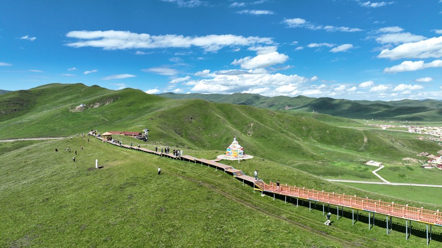 This aerial photo taken on July 6, 2023 shows tourists enjoying the scenery of the Awancang Wetland in Maqu County, Gannan Tibetan Autonomous Prefecture of northwest China's Gansu Province. (Xinhua/Chen Bin)