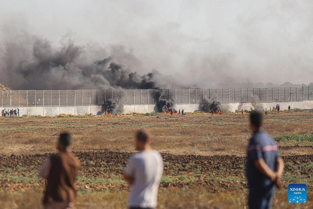 Smoke rises during clashes between Palestinians and Israeli soldiers near the fence of the Gaza-Israel border, east of Gaza City, on Sept. 15, 2023. (Photo by Rizek Abdeljawad/Xinhua)