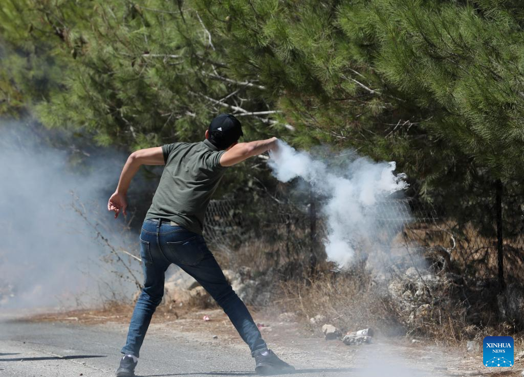 A Palestinian protester throws back a tear gas canister fired by a member of Israeli security forces during clashes following a protest against the expansion of Jewish settlements in the West Bank village of Qaryut, south of Nablus, on Sept. 15, 2023. (Photo by Ayman Nobani/Xinhua)