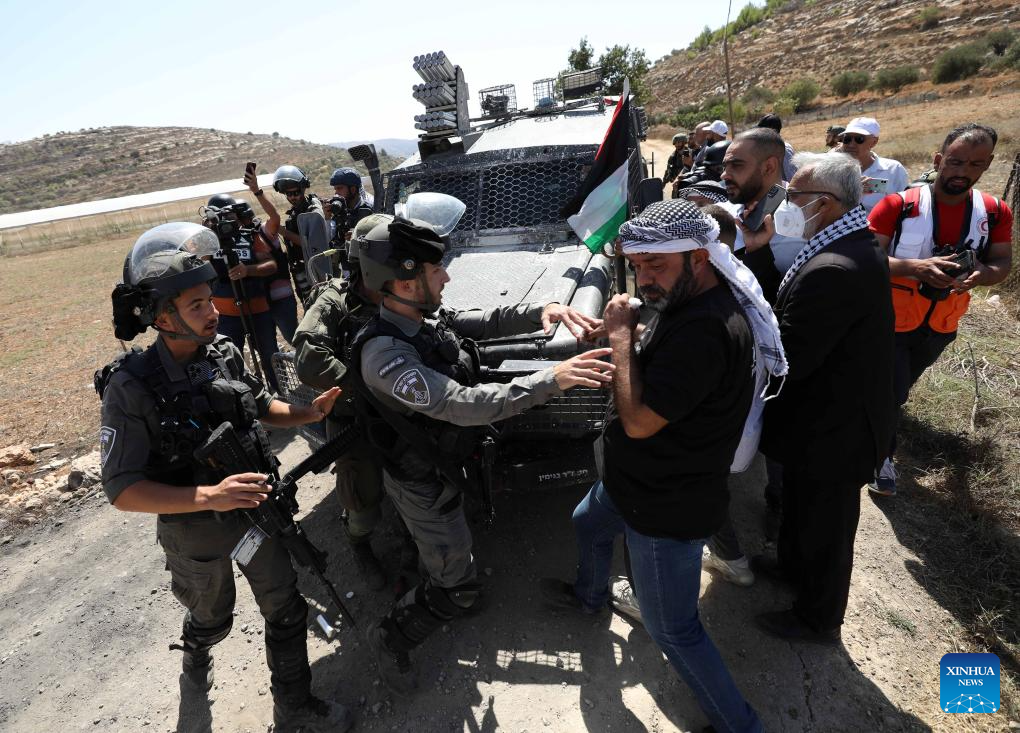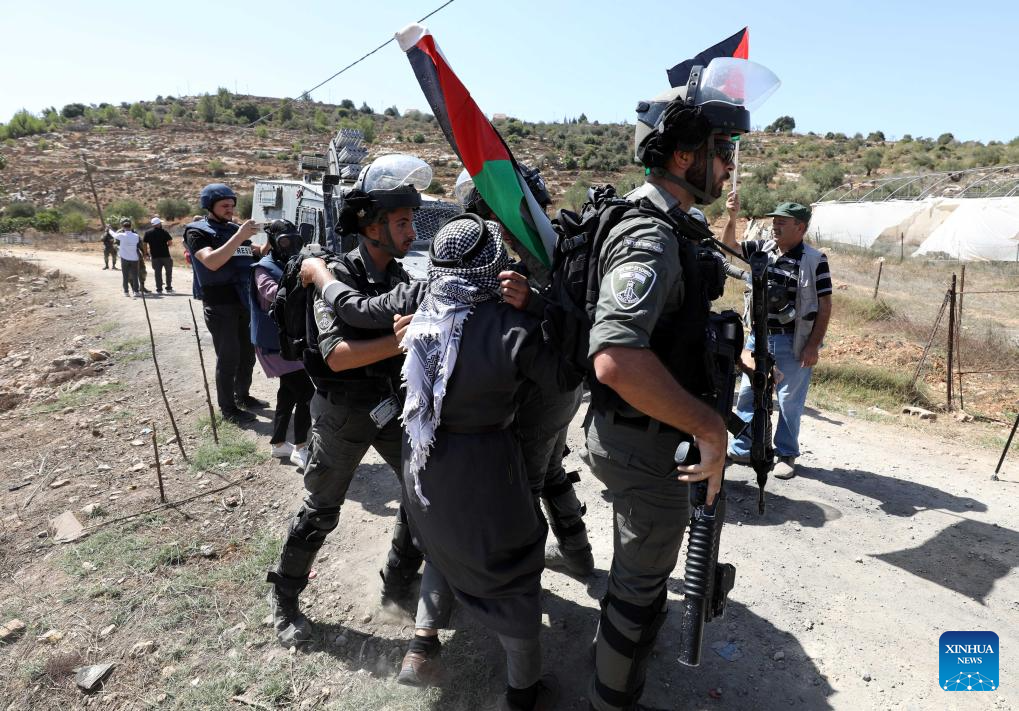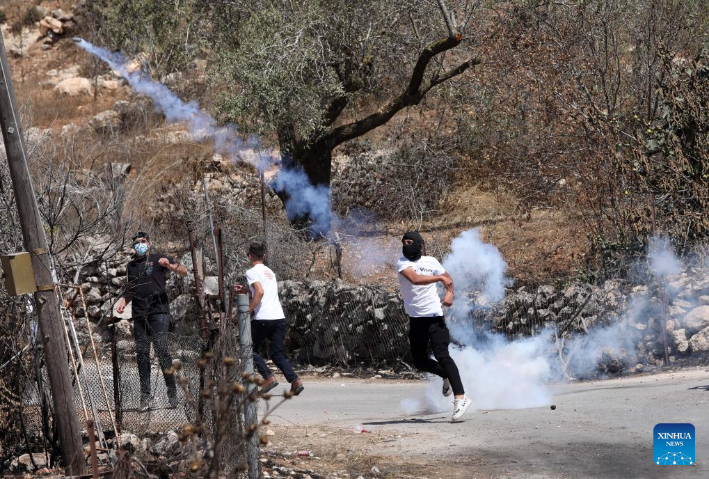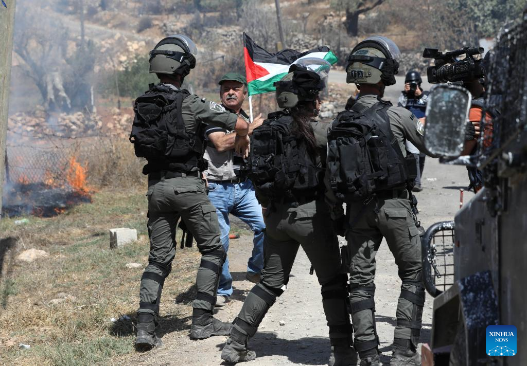 Palestinian protesters clash with Israeli security forces following a protest against the expansion of Jewish settlements in the West Bank village of Qaryut, south of Nablus, on Sept. 15, 2023. (Photo by Ayman Nobani/Xinhua)