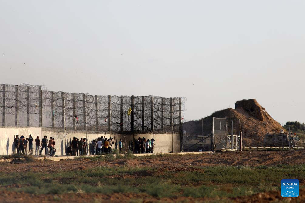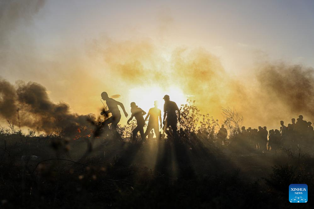 Palestinian protesters are seen during clashes with Israeli soldiers near the fence of the Gaza-Israel border, east of Gaza City, on Sept. 15, 2023. (Photo by Rizek Abdeljawad/Xinhua)