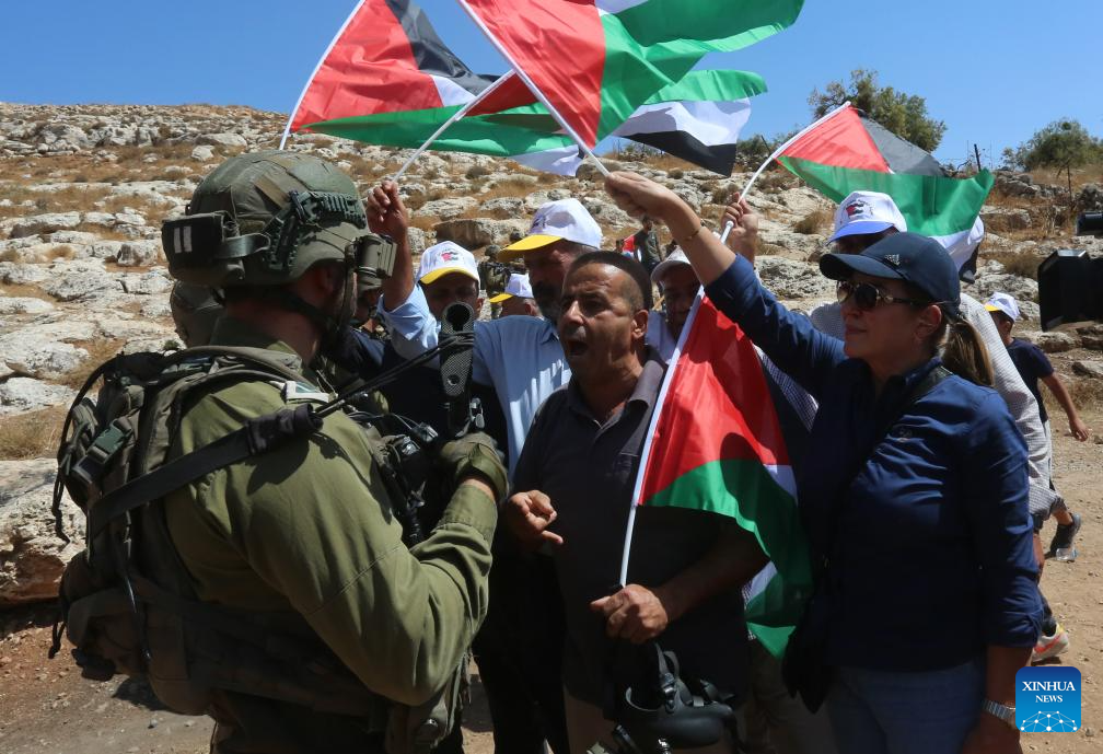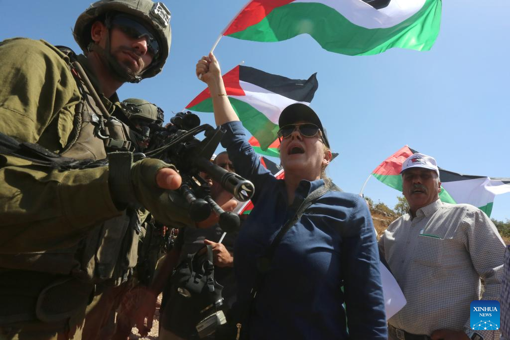 Palestinian protesters hold flags during a protest against the expansion of Jewish settlements in the West Bank village of Beit Dajan, east of Nablus, on Sept. 15, 2023. (Photo by Nidal Eshtayeh/Xinhua)