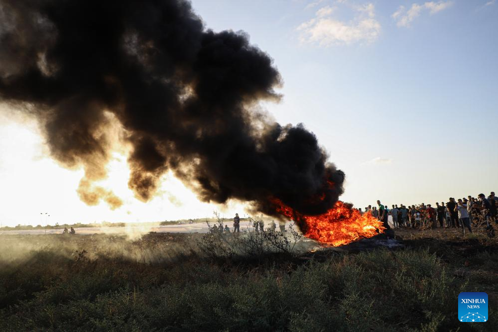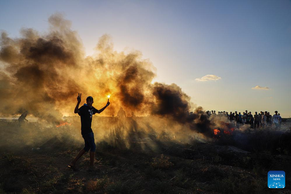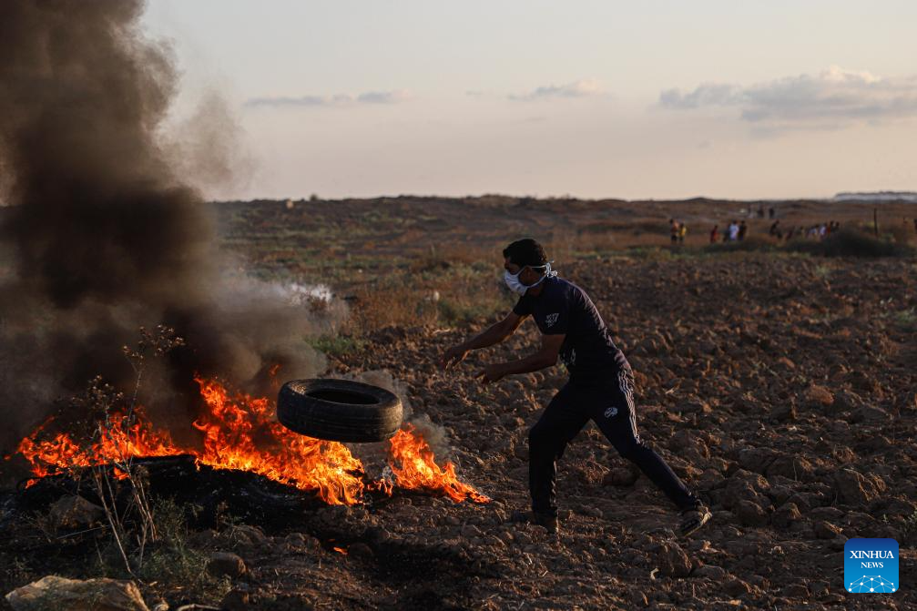 A Palestinian protester burns a tire during clashes with Israeli soldiers near the fence of the Gaza-Israel border, east of Gaza City, on Sept. 15, 2023. (Photo by Rizek Abdeljawad/Xinhua)
