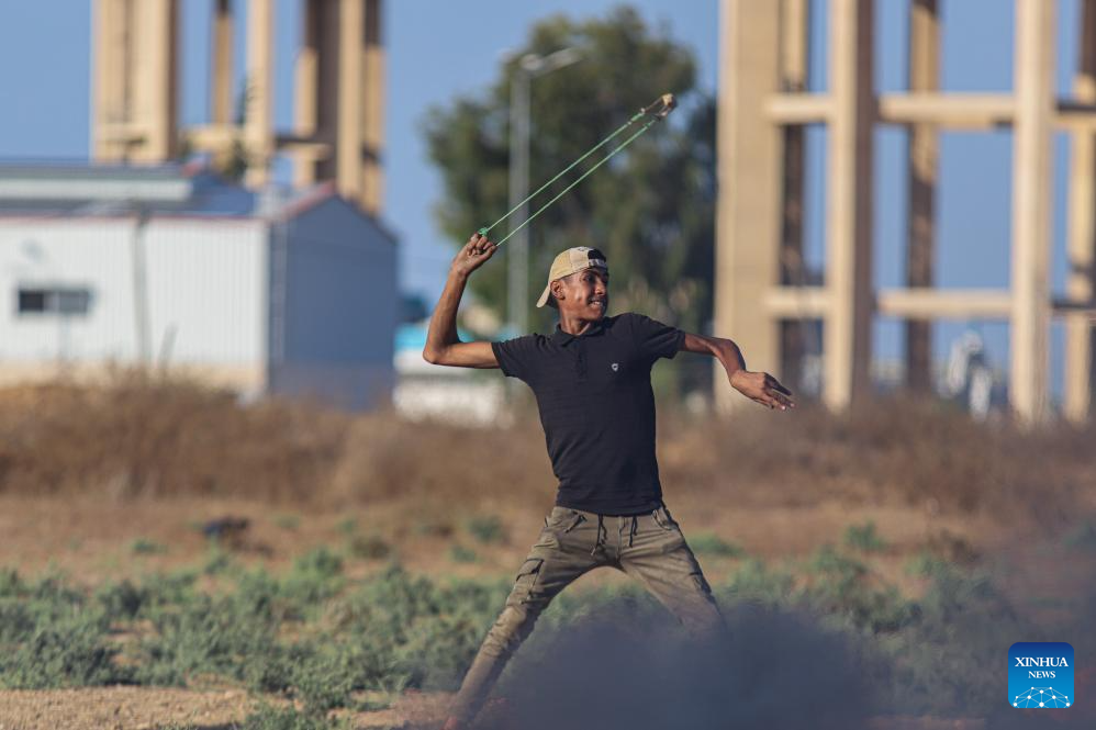 A Palestinian protester uses a slingshot to hurl a stone toward Israeli soldiers during clashes near the fence of the Gaza-Israel border, east of Gaza City, on Sept. 15, 2023. (Photo by Rizek Abdeljawad/Xinhua)