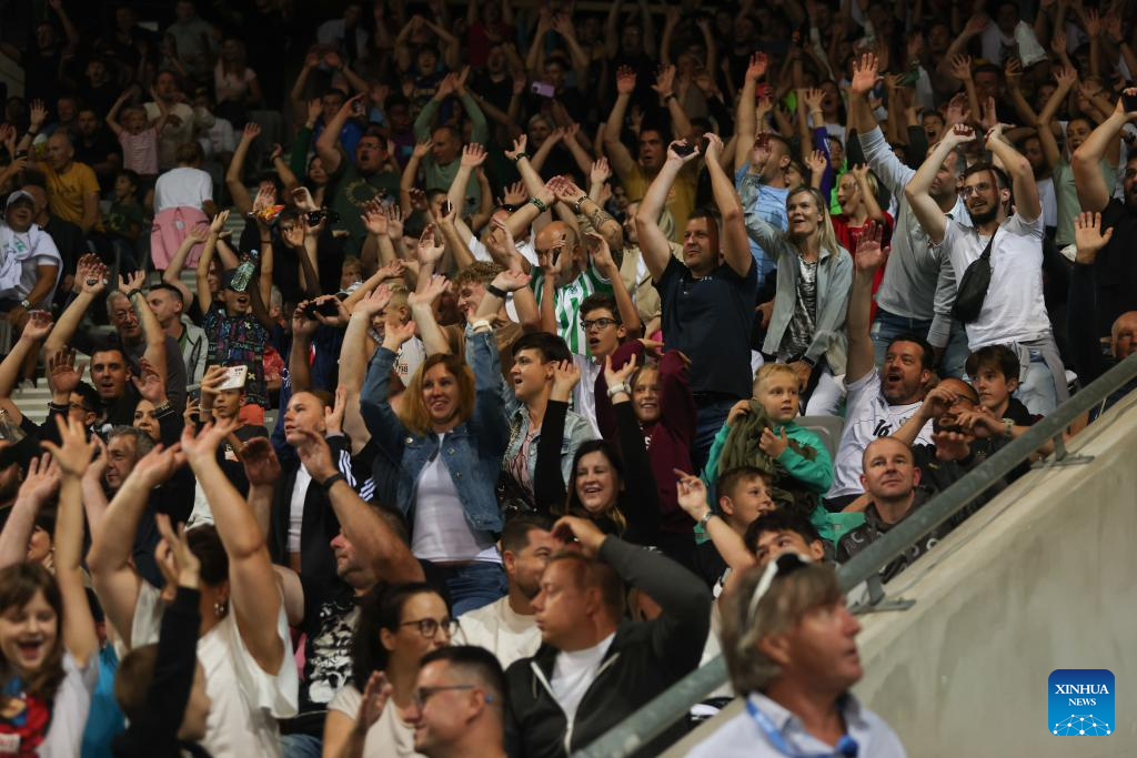 Fans cheer during a charity football match at Stozice Stadium in Ljubljana, Slovenia, Sept. 15, 2023. Former football stars played a charity match here to raise funds for those affected by floods which hit Slovenia in early August. (Photo by Zeljko Stevanic/Xinhua)