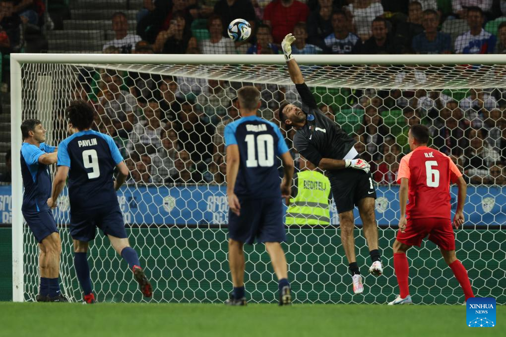 Goalkeeper Gianluigi Buffon (2nd R) makes a save during a charity football match at Stozice Stadium in Ljubljana, Slovenia, Sept. 15, 2023. Former football stars played a charity match here to raise funds for those affected by floods which hit Slovenia in early August. (Photo by Zeljko Stevanic/Xinhua)