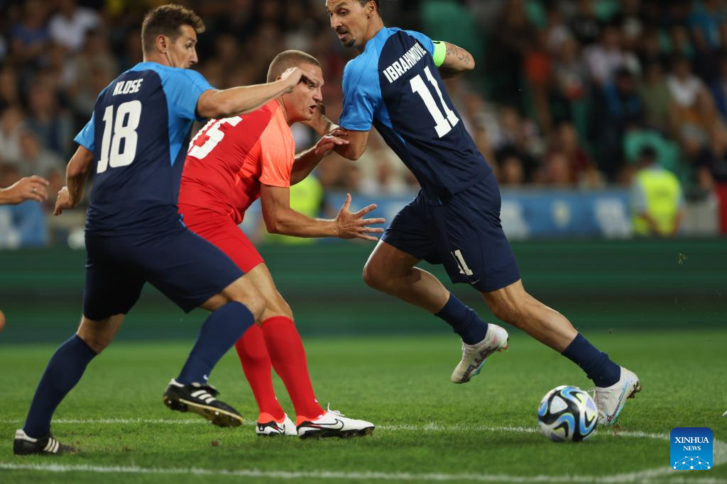 Nemanja Vidic (C), Miroslav Klose (L) and Zlatan Ibrahimovic compete during a charity football match at Stozice Stadium in Ljubljana, Slovenia, Sept. 15, 2023. Former football stars played a charity match here to raise funds for those affected by floods which hit Slovenia in early August. (Photo by Zeljko Stevanic/Xinhua)