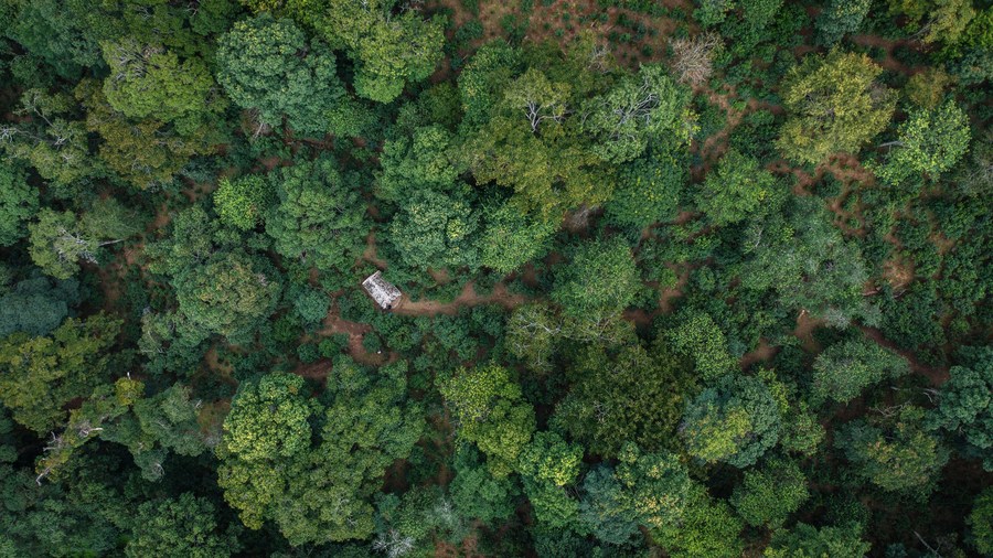 This aerial photo taken on Aug. 30, 2023 shows the old tea forests of Jingmai Mountain in Pu'er, southwest China's Yunnan Province. (Xinhua/Li He)