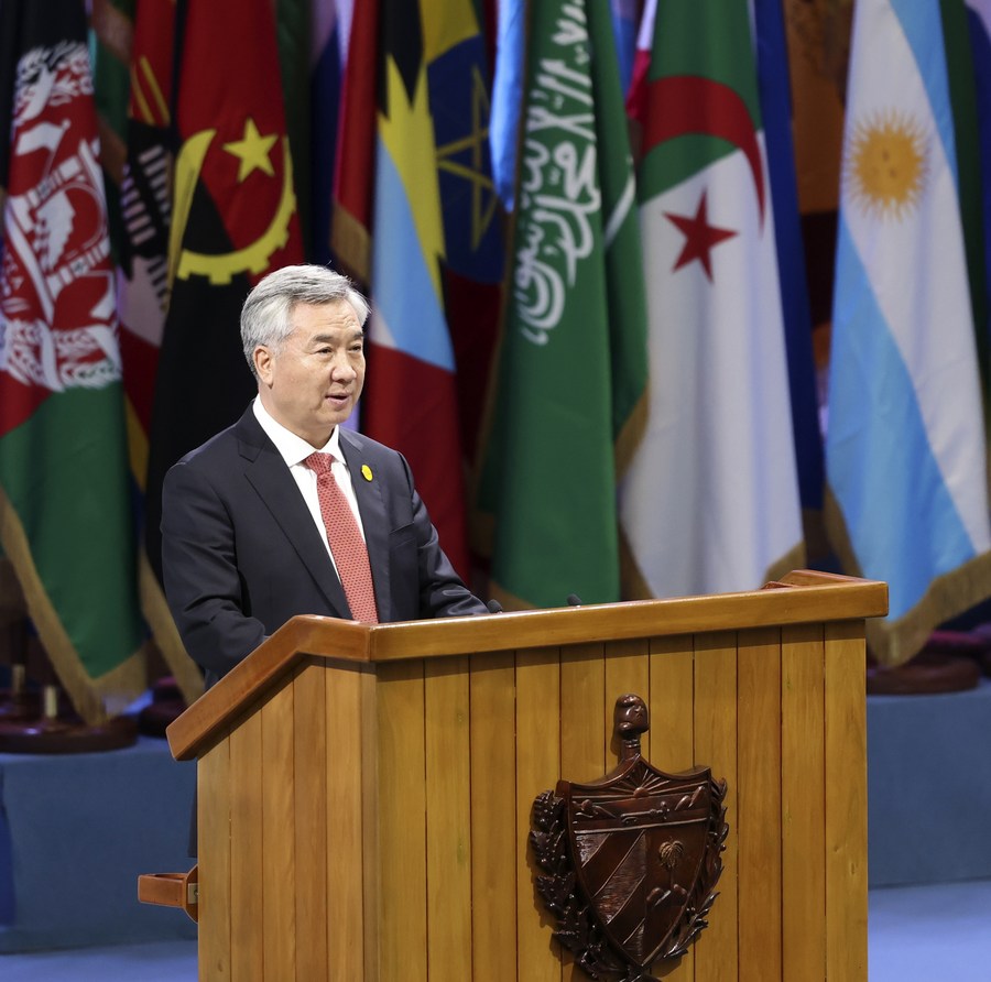 Li Xi, a member of the Standing Committee of the Political Bureau of the Communist Party of China Central Committee and the special representative of Chinese President Xi Jinping, speaks at the Summit of the Group of 77 (G77) and China in Havana, Cuba, Sept. 15, 2023. (Xinhua/Ding Haitao)