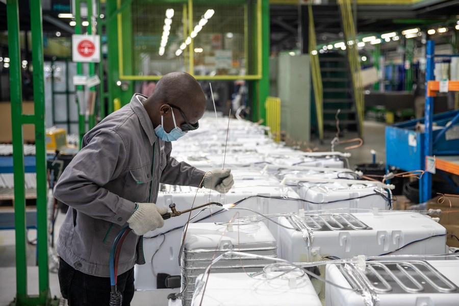 A worker operates on the refrigerator production line at Hisense South Africa Industrial Park in Cape Town, South Africa, June 1, 2022. (Xinhua/Lyv Tianran)