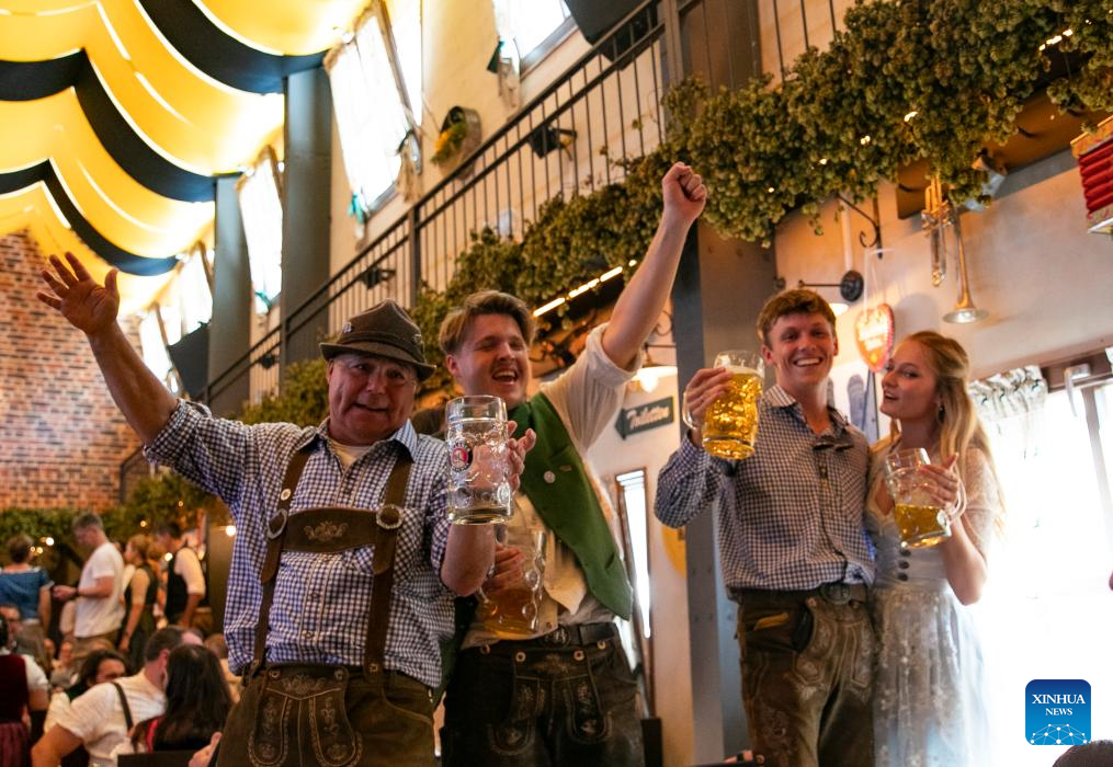 People enjoy beer at the Oktoberfest in Munich, Germany, Sept. 16, 2023. The 188th Oktoberfest, one of the largest folk festivals in Germany, officially opened here on Saturday. It is expected to conclude on Oct. 3. (Xinhua/Zhang Fan)