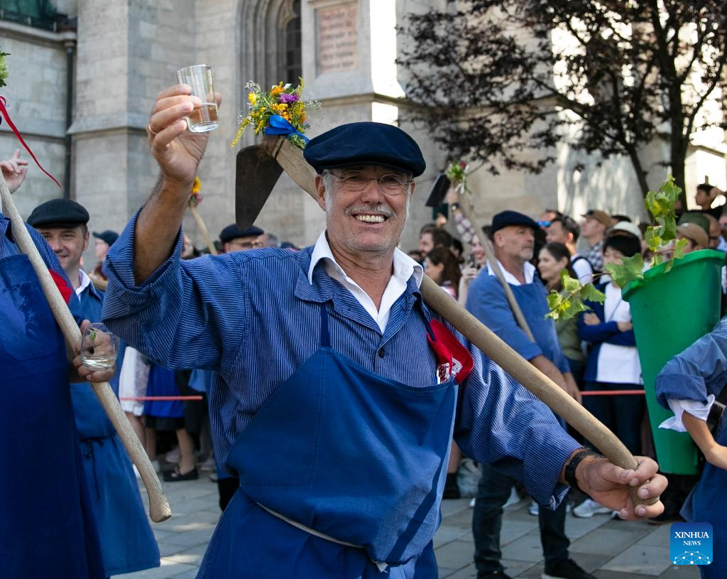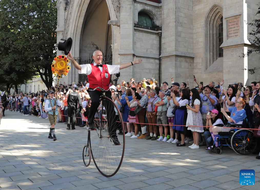 People attend the parade during the official opening of the Oktoberfest in Munich, Germany, Sept. 16, 2023. The 188th Oktoberfest, one of the largest folk festivals in Germany, officially opened here on Saturday. It is expected to conclude on Oct. 3. (Xinhua/Zhang Fan)