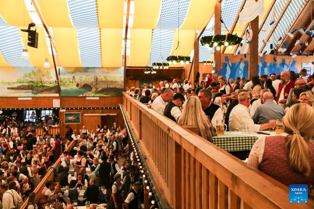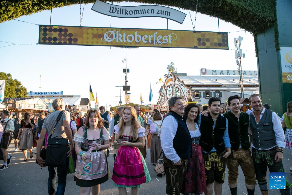 People visit the Oktoberfest in Munich, Germany, Sept. 16, 2023. The 188th Oktoberfest, one of the largest folk festivals in Germany, officially opened here on Saturday. It is expected to conclude on Oct. 3. (Xinhua/Zhang Fan)