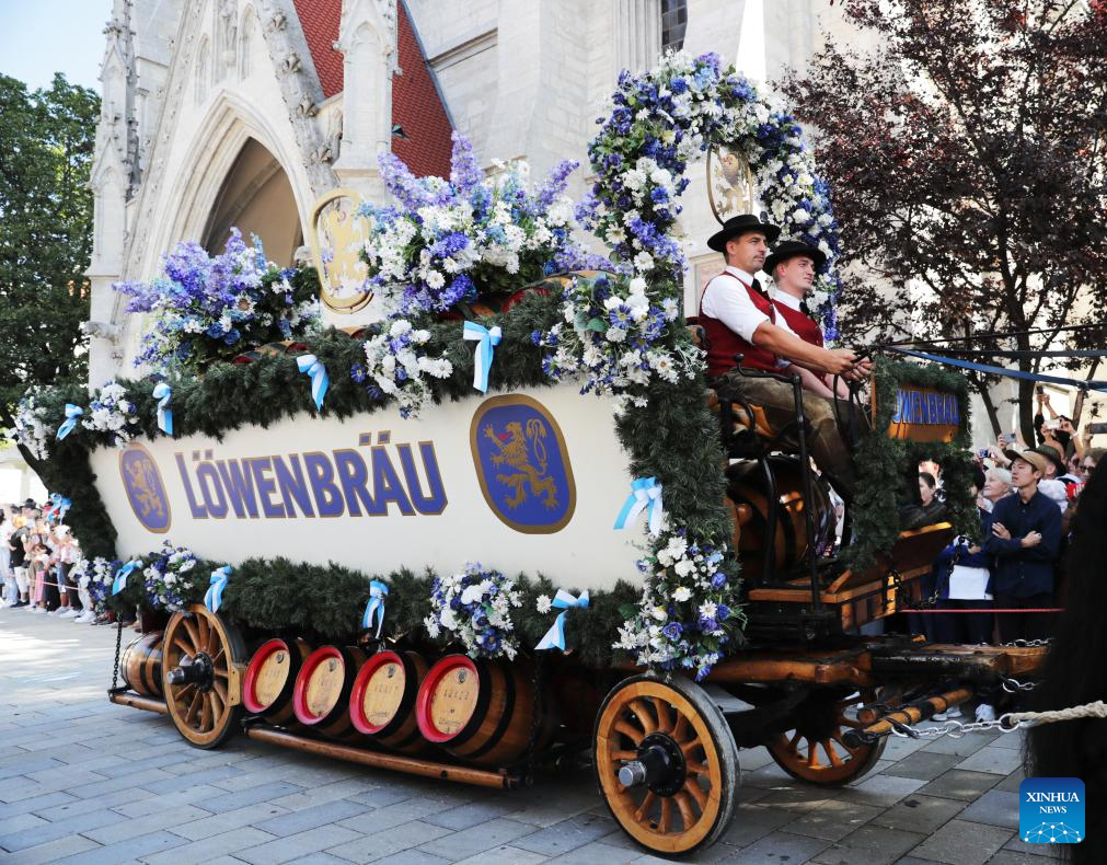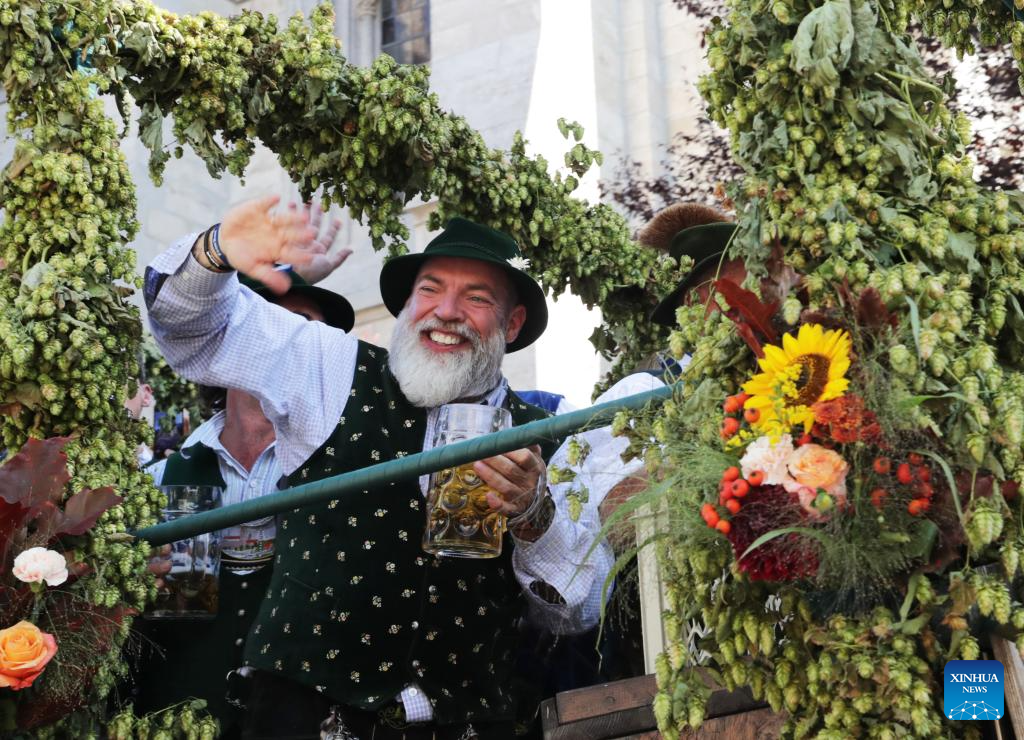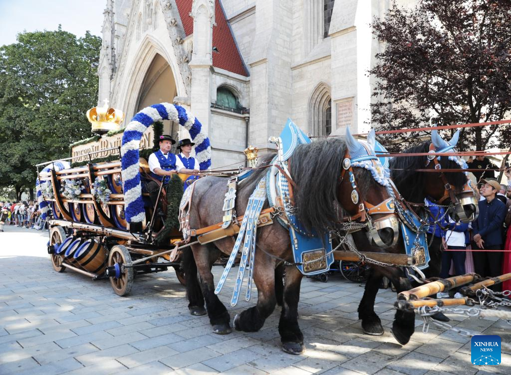 A wagon of a local beer brand attends the parade during the official opening of the Oktoberfest in Munich, Germany, Sept. 16, 2023. The 188th Oktoberfest, one of the largest folk festivals in Germany, officially opened here on Saturday. It is expected to conclude on Oct. 3. (Xinhua/Zhang Fan)