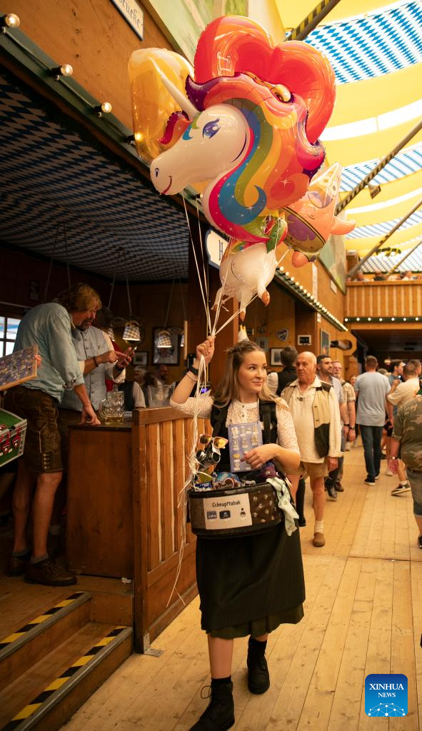 A staff member sells balloons at the Oktoberfest in Munich, Germany, Sept. 16, 2023. The 188th Oktoberfest, one of the largest folk festivals in Germany, officially opened here on Saturday. It is expected to conclude on Oct. 3. (Xinhua/Zhang Fan)