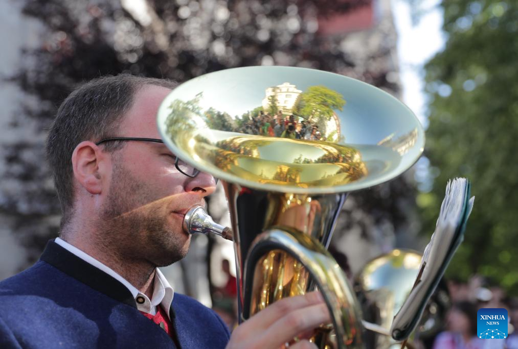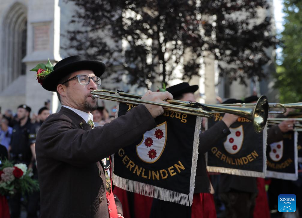 A musician attends the parade during the official opening of the Oktoberfest in Munich, Germany, Sept. 16, 2023. The 188th Oktoberfest, one of the largest folk festivals in Germany, officially opened here on Saturday. It is expected to conclude on Oct. 3. (Xinhua/Zhang Fan)
