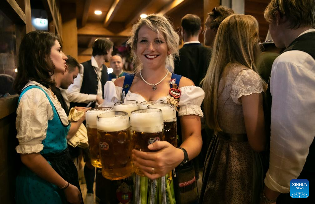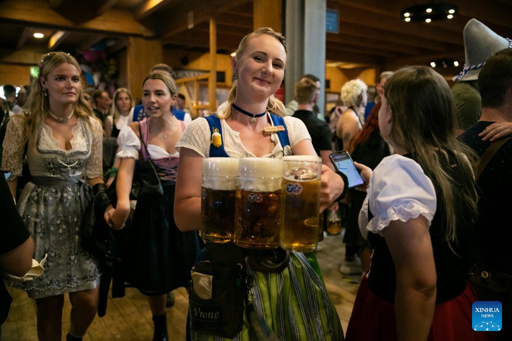 A staff member serves beer at the Oktoberfest in Munich, Germany, Sept. 16, 2023. The 188th Oktoberfest, one of the largest folk festivals in Germany, officially opened here on Saturday. It is expected to conclude on Oct. 3. (Xinhua/Zhang Fan)